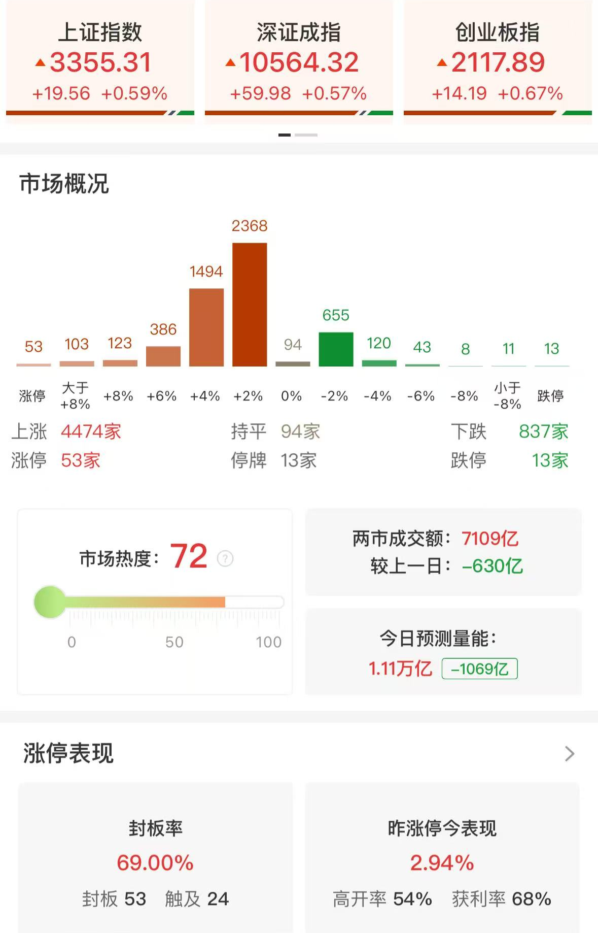 财联社4月1日电,市场早盘震荡反弹,创业板指领涨,沪深两市半日成交额7109亿,较上个交易日缩量630亿。盘面上市场热点集中在医药等方向,个股普涨,全市场超4400只个股上涨。从板块来看,医药股集体走强,创新药等方向领涨,昭衍新药等多股涨停。可控核聚变概念股再度大涨,合锻智能等涨停。军工股表现活跃,中航沈飞等多股涨超5%。板块方面,可控核聚变、创新药、医疗器械、中药等板块涨幅居前,银行、通信服务、贵金属、智谱AI等板块跌幅居前。截至收盘,沪指涨0.59%,深成指涨0.57%,创业板指涨0.67%。