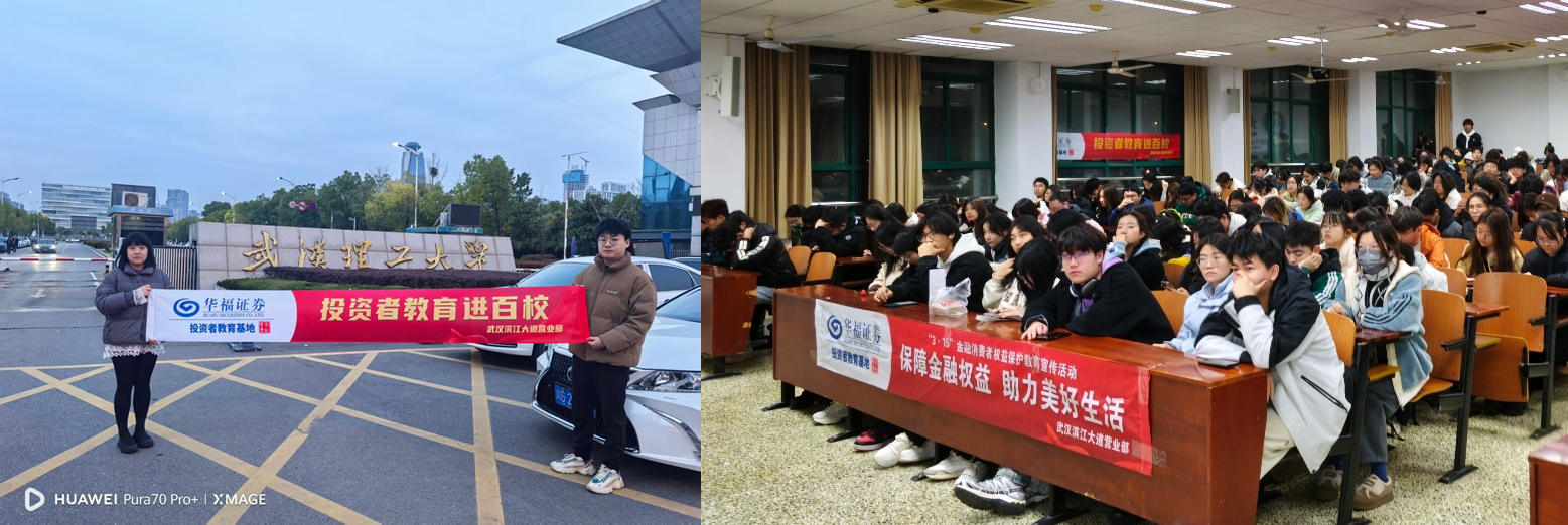 为持续推动投资者教育走进校园,助力培养具备专业素养和创新能力的金融人才,为深入贯彻落实投资者教育理念,积极响应"3.15金融消费者权益保护"号召,华福证券武汉滨江大道证券营业部于2025年3月16日走进武汉理工大学经济学院,成功举办投资者教育进百校——“保障金融权益 助力美好生活”主题教育活动。本次活动共吸引270余名在校学生参与,通过知识普及、案例解析与互动交流,助力青年学子提升金融风险防范意识,筑牢理性投资理念。