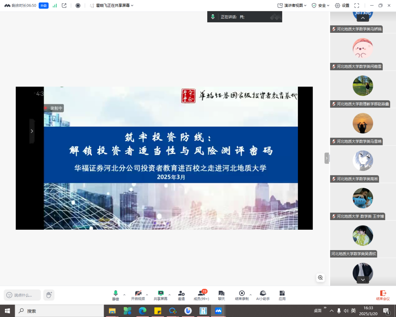 为弘扬新时代雷锋精神,践行社会主义核心价值观,积极响应“将投资者教育纳入国民教育体系”的号召,3月20日,华福证券河北分公司联合河北地质大学举办“筑牢投资防线 解锁投资者适当性与风险测评密码”线上专题培训。100余名师生齐聚云端,开启了一场生动的投资者教育实践。