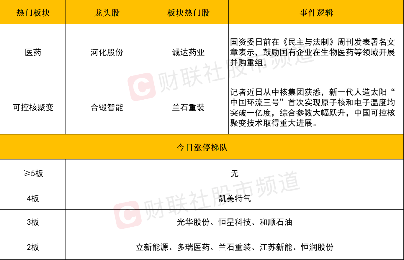 今日短线情绪略有回暖,涨停与连板股数量较之昨日略有提升。其中可控核聚变概念全线爆发,核心标的合锻智能7天5板,兰石重装6天3板,而中国核建、国光电气等相对后排的个股也于今日盘中进一步加强。生物医药方向再度活跃,回盛生物完成反包录得5天3板,河化股份、金河生物同样涨停,不过医药股更多呈现出趋势性的上涨模式,后续仍可留意一些活跃度较高的个股的回调低吸机会。化工股同样获得了部分资金的回流,其中红宝丽上演“地天板”,而华融化学、汇得科技等个股涨停,不过作为前期人气高标的中毅达今日反核失败最终仍以跌停报收,可见市场对于该方向的分歧依旧较大。光刻机概念同样呈现局部活跃态势,凯美特气晋级4板(最高连板股),新莱应材同样涨超10%,国风新材也再度涨停。总体而言,在存量博弈的市场环境下,各热点间大概率延续震荡轮动态势,因此上述人气题材核心个股的市场反馈,或一定程度的反映出该题材的当日的强弱,也可视为盘中应对上的重要参考依据。