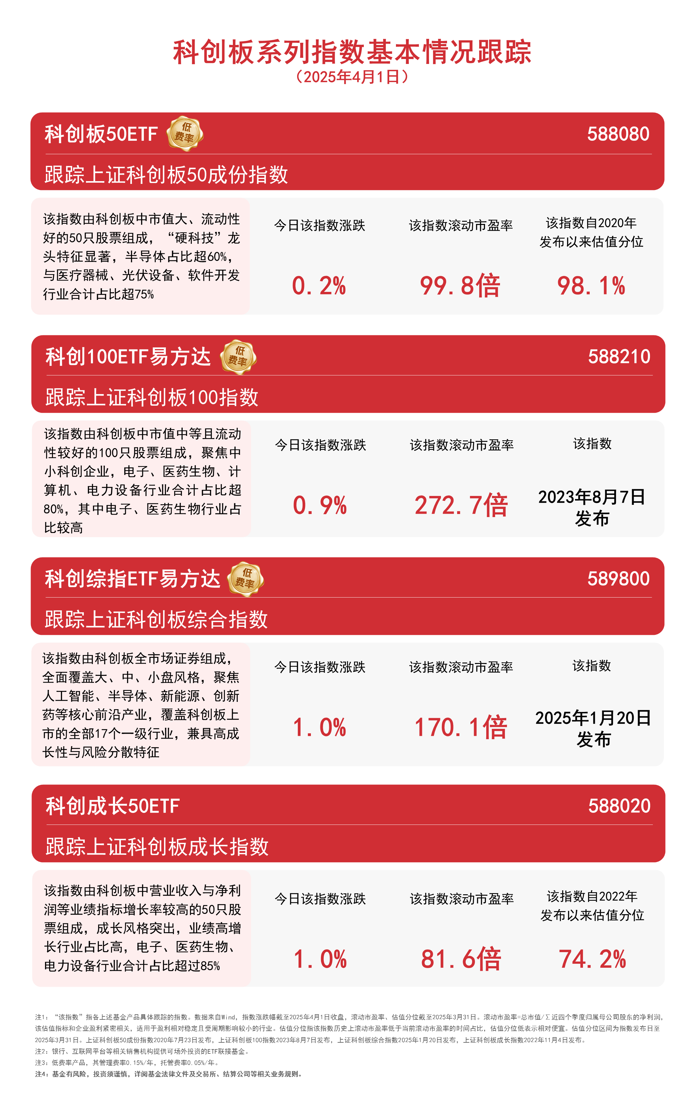 截至收盘,上证科创板成长指数、科创综指均上涨1.0%,科创100指数上涨0.9%,上证科创板50成份指数上涨0.2%。Wind数据显示,科创板50ETF(588080)上个交易日获近1.2亿资金净流入。