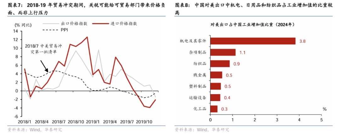 综合考虑进出口关税调整的影响,短期内部分可贸易部门的价格可能面临一定压力。我国2024年中国对美出口为5,247亿美元,对美出口占全部出口的份额已从2018年的19.2%下降至2024年的14.7%,按照当前美国的关税政策,年内美国已累计对中国进口商品加征关税约54个百分点,美国对中国商品加征大幅关税可能在短期内导致相关行业的价格面临一定调整压力,尤其是中国对美出口占比较高的行业,不过中国的反制措施或部分对冲价格下行压力。2024年中国对美出口中,机械设备占比达41.6%,日用品和纺织品的占比分别为12.3%和6.2%(图表6),上述行业短期内受影响可能相对偏大。2018-19年中美贸易摩擦期间,尽管进口商品价格显著上行,但PPI走势整体平稳(图表7)。不过,考虑到特朗普的关税政策随机性较强,例如美国对墨西哥和加拿大等国的关税反复调整,后续中美贸易摩擦的演绎、以及关税对价格水平的影响还有待观察。