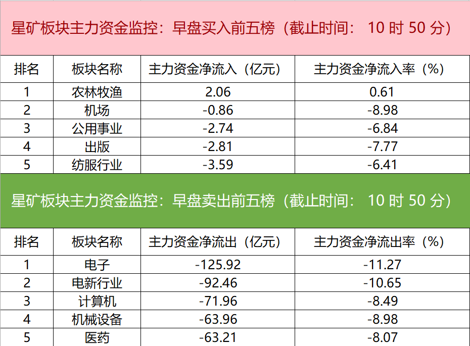 财联社4月7日电,财联社星矿数据显示,今日早盘主力资金仅净流入农林牧渔板块,净流出电子、电新行业、计算机等板块,其中电子板块净流出超125亿元。个股方面,凯美特气涨停,主力资金净买入4.62亿元位居首位,中国软件、神农种业、北大荒获主力资金净流入居前;贵州茅台遭净卖出超13亿元,东方财富、比亚迪、中国平安主力资金净流出额居前。
