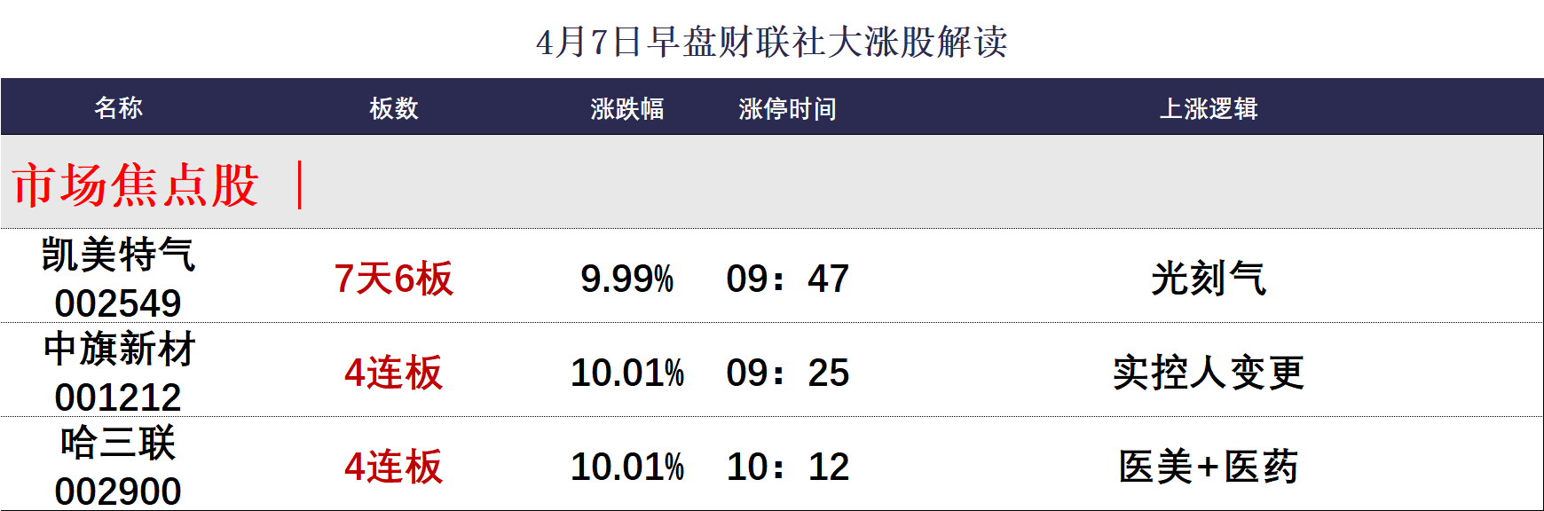 财联社4月7日电,今日午盘全市场共25股涨停,连板股总数12只,5股封板未遂,封板率为83%(不含ST股、退市股)。焦点股方面,凯美特气上演地天板走出7天6板,中旗新材、哈三联均晋级4连板。