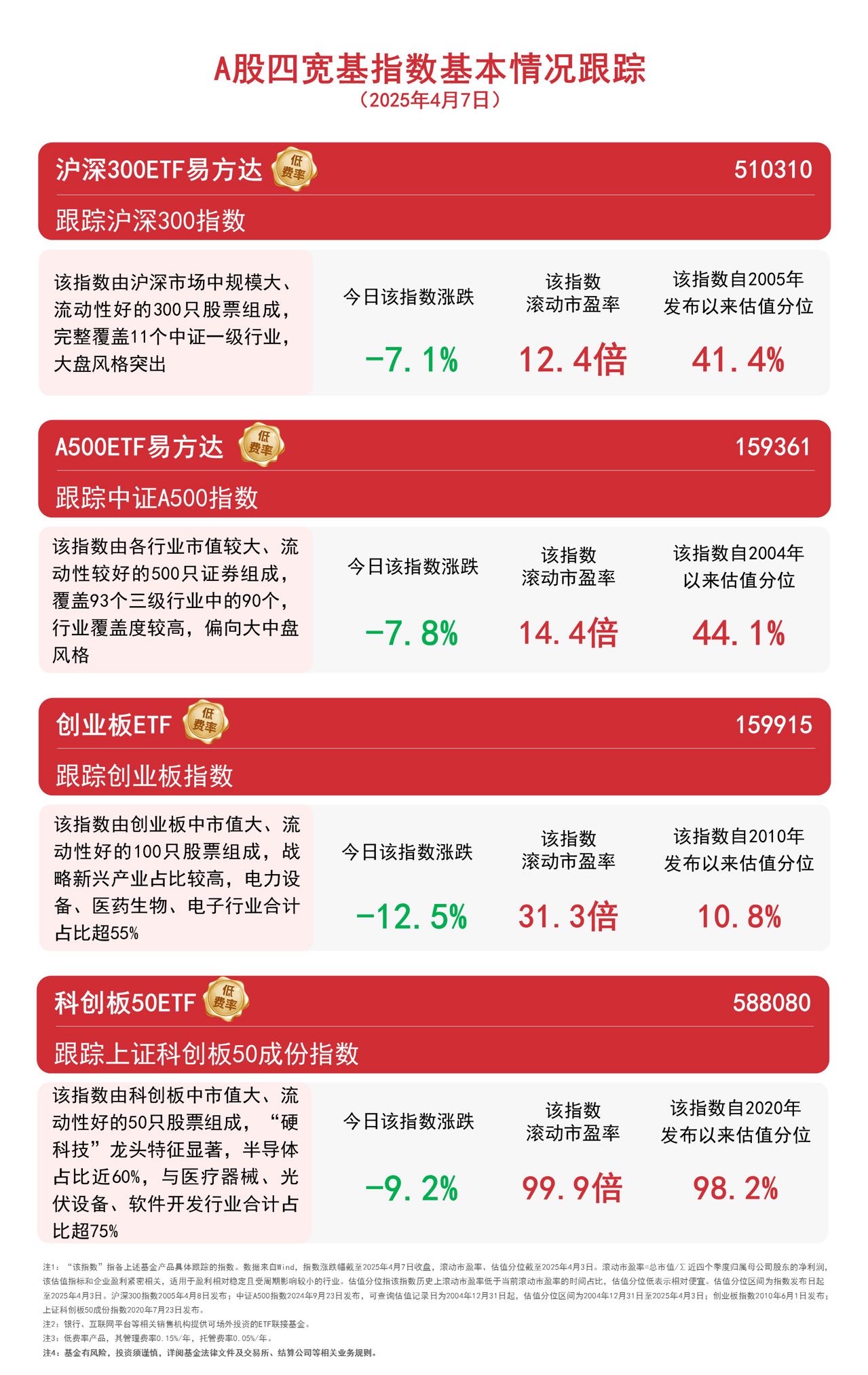A股全天低开低走,市场成交额1.6万亿,较上个交易日放量超4500亿。板块方面,农业等少数板块上涨,电池、消费电子、计算机设备等板块跌幅居前。截至收盘,中证A500指数下跌7.8%,沪深300指数下跌7.1%,创业板指数下跌12.5%,上证科创板50成份指数下跌9.2%。