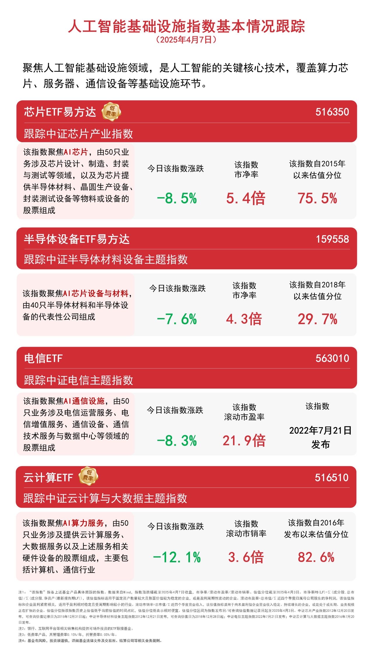 截至收盘,中证半导体材料设备主题指数下跌7.6%,中证电信主题指数下跌8.3%,中证芯片产业指数下跌8.5%,中证云计算与大数据主题指数下跌12.1%。