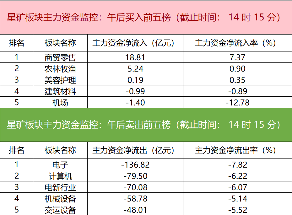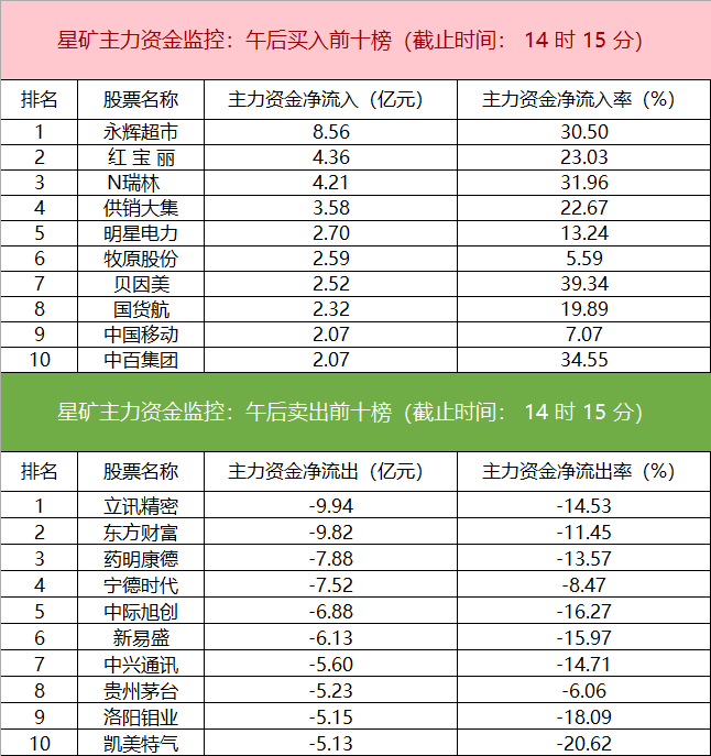 财联社4月8日电,财联社星矿数据显示,今日主力资金净流入商贸零售、农林牧渔、美容护理等板块,净流出电子、计算机、电新行业等板块,其中电子板块净流出超136亿元。个股方面,永辉超市涨停,主力资金净买入8.56亿元位居首位,红宝丽、N瑞林、供销大集主力资金净流入居前;立讯精密遭净卖出超9亿元位居首位,东方财富、药明康德、宁德时代主力资金净流出额居前。