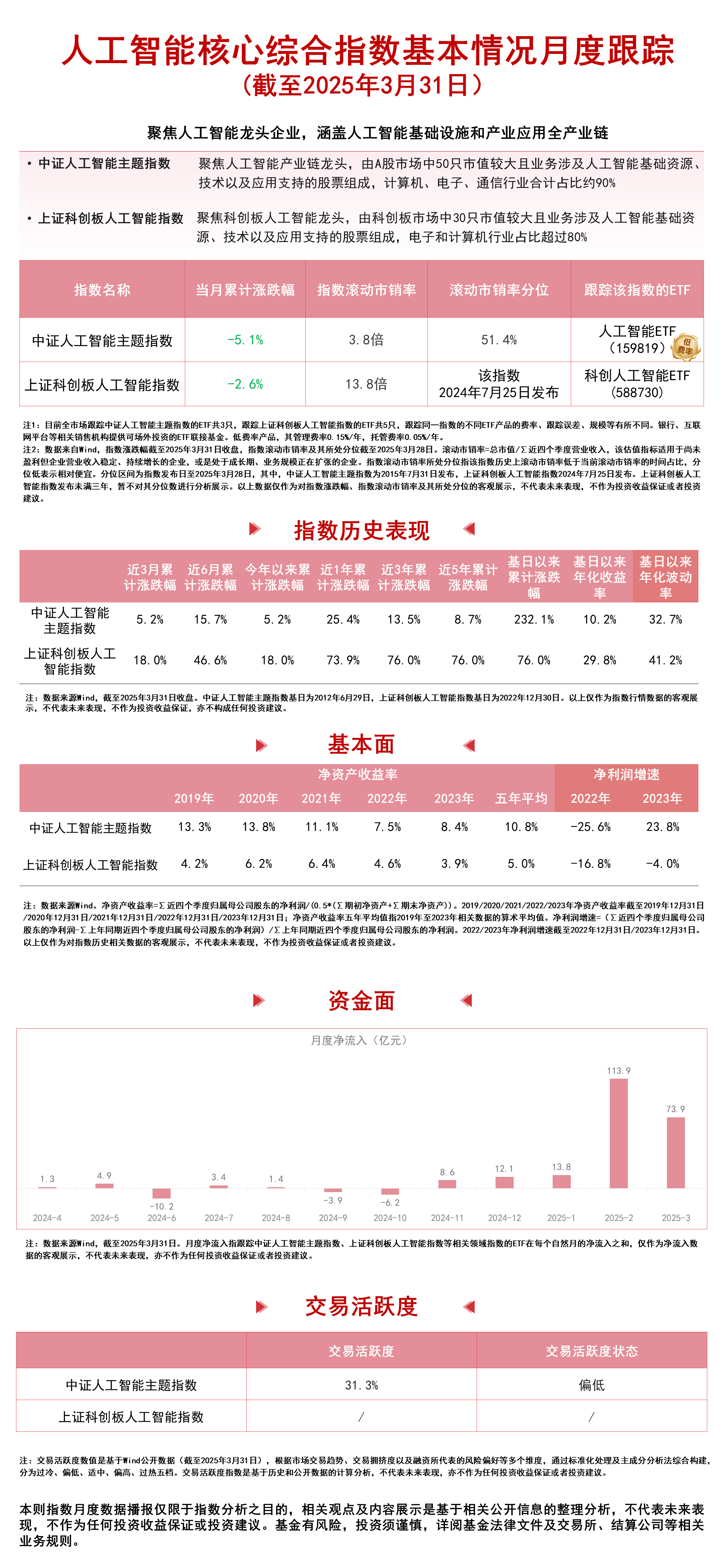 3月,上证科创板人工智能指数下跌2.6%,中证人工智能主题指数下跌5.1%,资金连续5个月净流入跟踪以上指数的ETF。