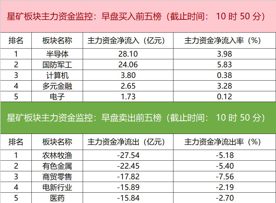 财联社4月9日电,财联社星矿数据显示,今日早盘主力资金净流入半导体、国防军工、计算机板块,净流出农林牧渔、有色金属、商贸零售等板块,其中半导体板块净流入超28亿元。个股方面,中国长城涨停,主力资金净买入10.61亿元位居首位,紫光国微、中芯国际、北方华创获主力资金净流入居前;永辉超市遭净卖出超9亿元,供销大集、药明康德、神农种业主力资金净流出额居前。