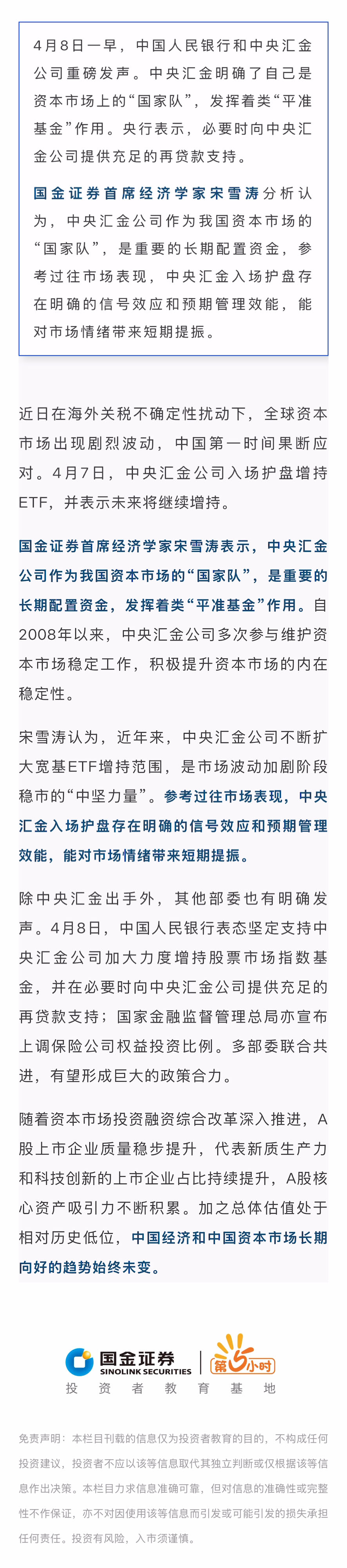 4月8日一早,中国人民银行和中央汇金公司重磅发声。中央汇金明确了自己是资本市场上的“国家队”,发挥着类“平准基金”作用。