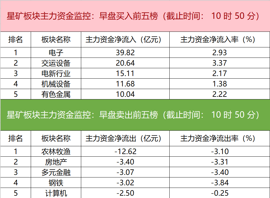 财联社4月10日电,财联社星矿数据显示,今日早盘主力资金净流入电子、交运设备、电新行业等板块,净流出农林牧渔、房地产、多元金融等板块,其中电子板块净流入超39亿元。个股方面,工业富联一度涨停,主力资金净买入5.40亿元位居首位,立讯精密、胜宏科技、双林股份获主力资金净流入居前;中国长城遭净卖出超12亿元,金河生物、北大荒、杭钢股份主力资金净流出额居前。