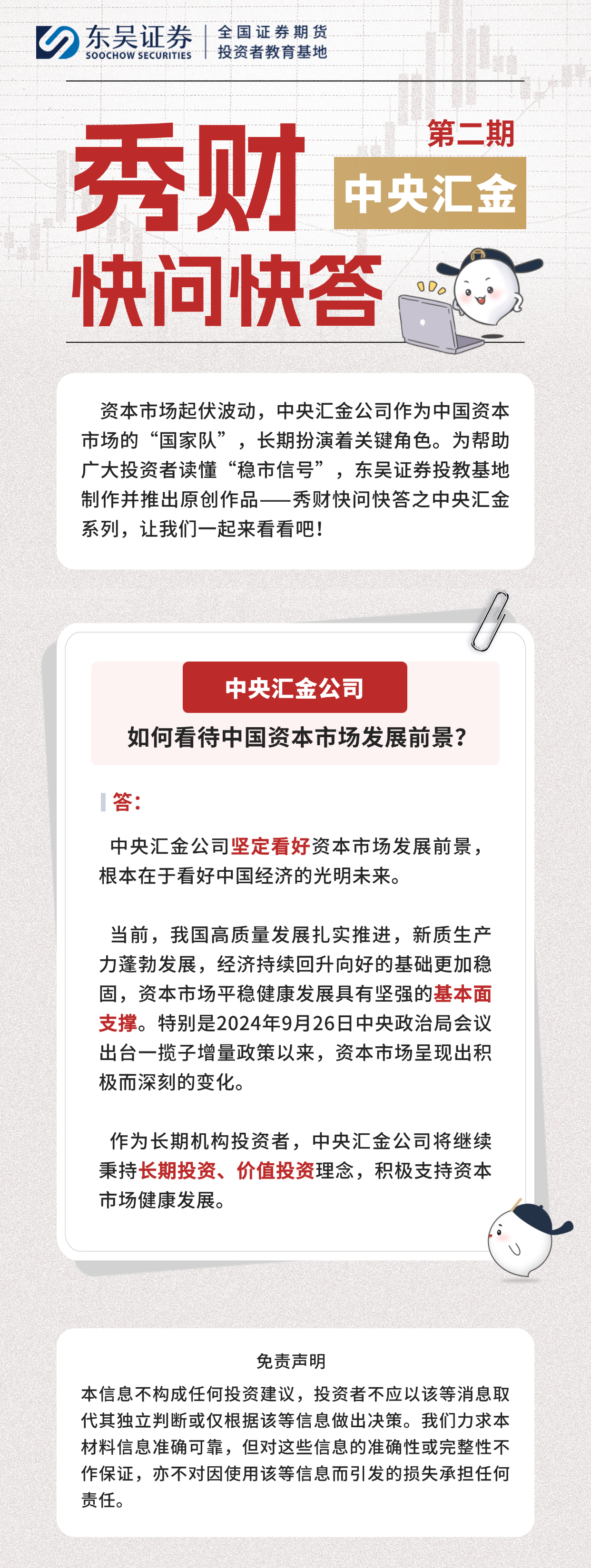 资本市场起伏波动,中央汇金公司作为中国资本市场的“国家队”,长期扮演着关键角色。为帮助广大投资者读懂“稳市信号”,东吴证券投教基地制作并推出原创作品——秀财快问快答之中央汇金系列,让我们一起来看看吧!