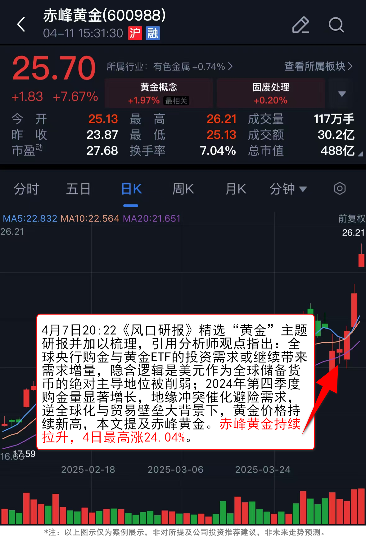 本文提及赤峰黄金,其在此后持续拉升,4个交易日最高涨幅达24.04%。