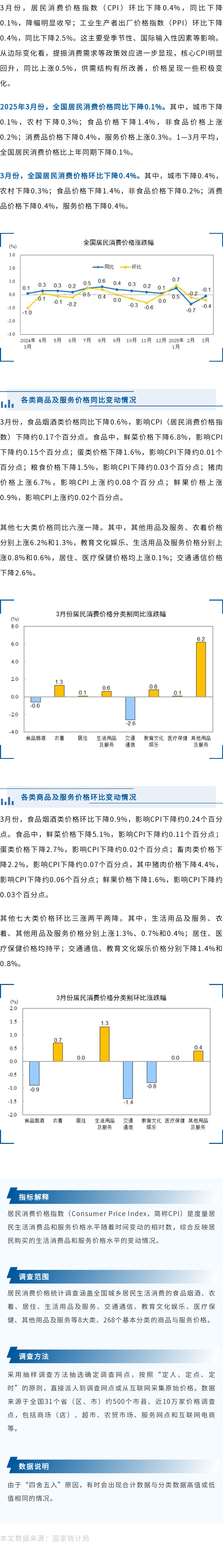 2025年3月CPI同比下降0.1%,降幅收窄,核心CPI回升@24