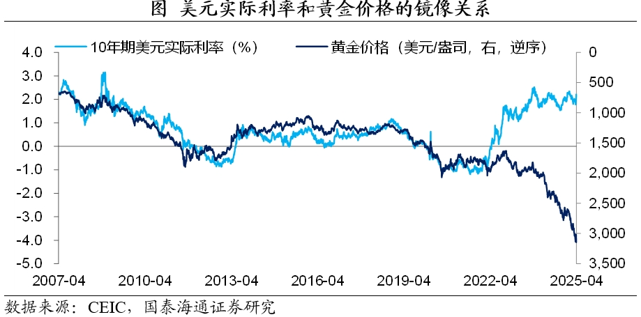 我们在《全球货币变局》系列专题三中就介绍过黄金的新定价模型。黄金是不生息的资产,实际利率为零,所以之前美元实际利率提高时,大家持有美元资产的意愿就会上升,黄金价格就会承压。而美元实际利率下降时,投资者持有美元资产的意愿就会下降,黄金价格就会上涨。美元实际利率和黄金之间,也是一种明显的镜像关系。而2022年以来,美国的经济增速没有特别明显的抬升,而美元的实际利率却回升到了2009年以来的最高位。在美元实际利率这么高的情况下,大家仍是愿意持有一个实际利率为零的黄金资产,这本身就说明了美元的信用在下降。这就相当于已经出现过违约事件的企业,如果要再借钱,就需要支付更高的利率,相当于信用利差在明显走阔。过去的全球贸易和货币循环是,美国借钱,其他的储蓄国存钱。