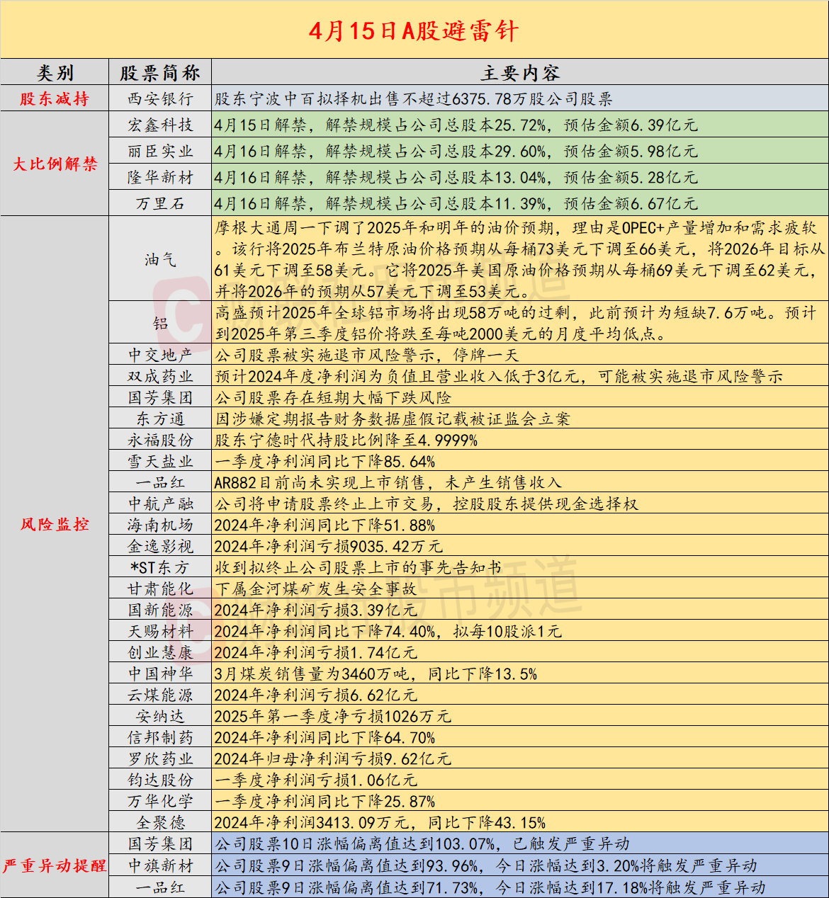 昨日公告的A股拟减持的公司数量较之前有所增多,西安银行股东宁波中百拟择机出售不超过6375.78万股公司股票;宏鑫科技、丽臣实业将迎来超二成以上解禁;旅游淡季到来,不少航线机票价格低至一到两折;中交地产公司股票被实施退市风险警示,停牌一天;半导体等商品豁免“对等关税”,产业链谨慎观望;东方通因涉嫌定期报告财务数据虚假记载被证监会立案;全球多家大型养老基金暂停对美投资,欧洲掀起抵制美货潮。