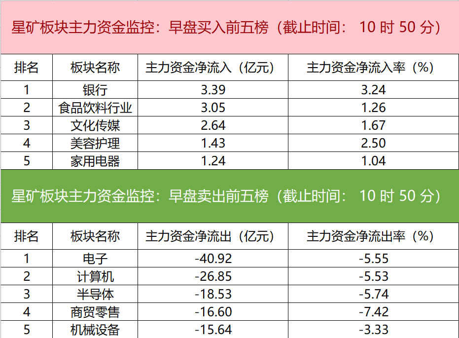 财联社4月15日电,财联社星矿数据显示,今日早盘主力资金净流入银行、食品饮料行业、文化传媒等板块,净流出电子、计算机、半导体等板块,其中电子板块净流出超40亿元。个股方面,红宝丽涨停,主力资金净买入4.58亿元位居首位,N信凯、岭南股份、胜宏科技获主力资金净流入居前;立讯精密遭净卖出超5亿元,万华化学、中国长城、南宁百货主力资金净流出额居前。