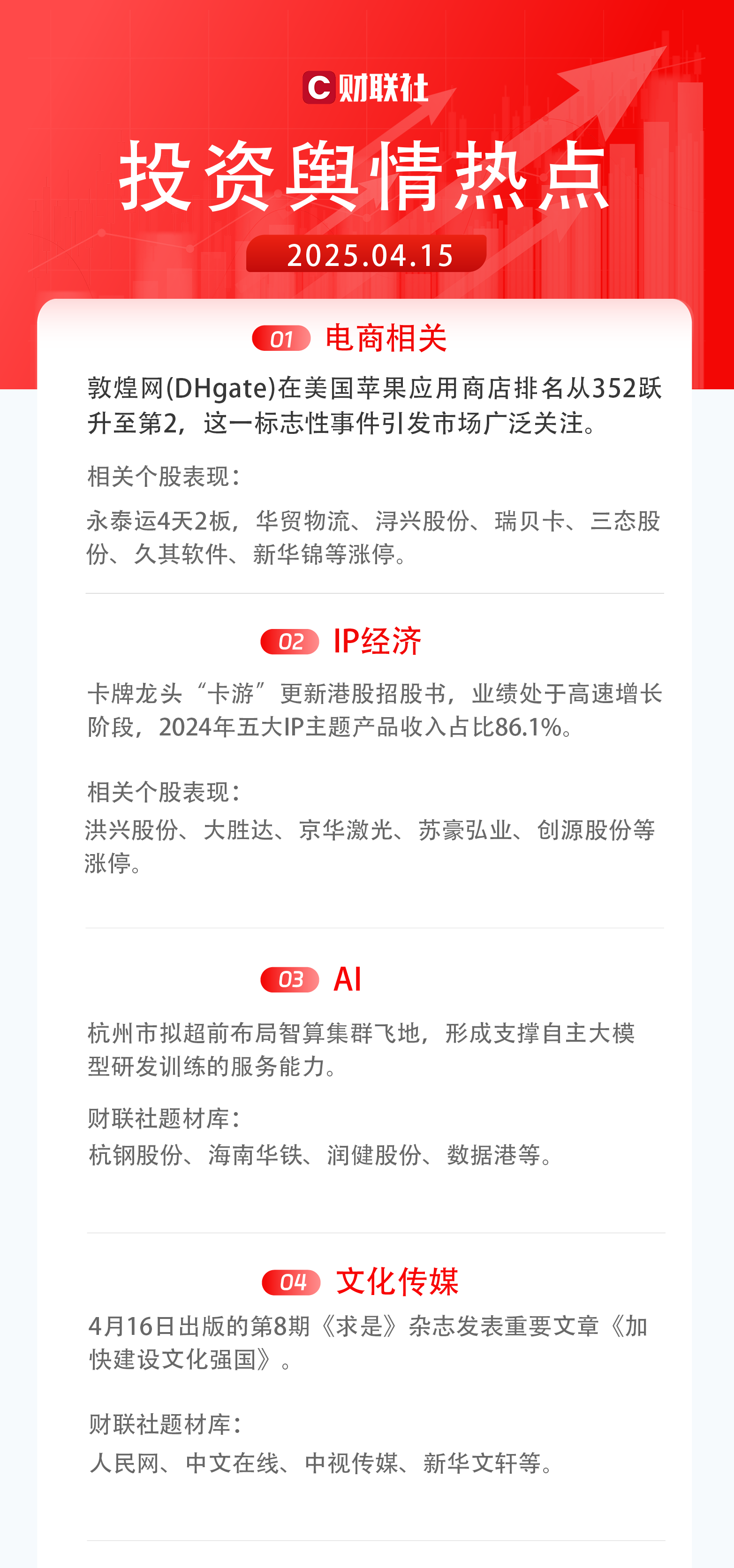 4)文化传媒:4月16日出版的第8期《求是》杂志发表重要文章《加快建设文化强国》。