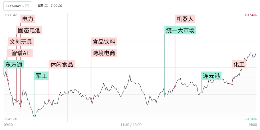 财联社4月16日电,市场全天探底回升,三大指数涨跌不一。个股跌多涨少,全市场超2800只个股下跌。沪深两市全天成交额1.08万亿,较前日缩量2003亿。1)商务部等6部门近日联合印发《关于组织开展“购在中国”系列活动的通知》,部署各地聚焦首发经济。大消费板块延续近期活跃态势,食品、零售、日用化工等方向均表现亮眼,两面针走出3连板,一致魔芋、盐津铺子、万辰集团等盘中创出历史新高。不过随着消费总龙头国芳集团午后炸板调整,板块内高位股表现仍相对承压,但无碍一些低位方向的不断涌现。包括早盘受到卡游公司申请港交所上市的消息刺激的文创IP概念,以及受益敦煌网APP下载量激增带动的跨境电商概念的批量爆发。2)近日,通用机器人公司傅利叶宣布正式发布首款开源人形机器人Fourier N1。机器人概念盘中局部回暖,南方精工午后涨停,双林股份、华民股份、东方精工、长盛轴承等不少人气股日内一度大幅冲高。3)根据近日工信部发布的《2025年工业和信息化标准工作要点》,明确提出将全固态电池作为重点领域,固态电池概念盘中表现不俗,叠加业绩预增的有研新材封死一字涨停,人气股领湃科技封20CM涨停。4)据百川数据,近期国内双季戊四醇价格连续上涨,4月14日双季戊四醇报价72700.00元/吨,较1月13日48000.00元/吨相比上涨了51.4%。化工人气股中毅达受此消息刺激,午后逆势涨停走出4天3板,进而带动江天化学、红宝丽等在内的多股涨停。