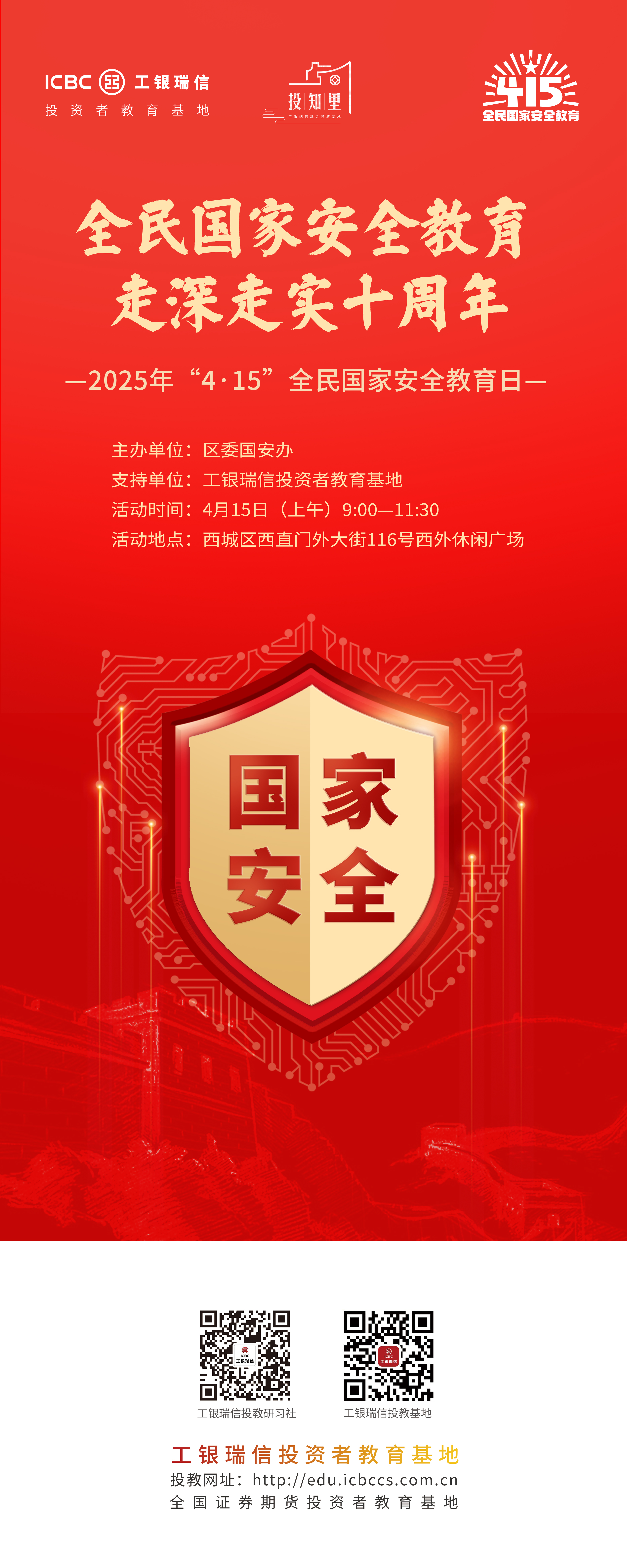 国家安全无小事,金融安全系万家。工银瑞信投教基地将深刻践行金融工作的政治性、人民性,以扎实的投资者教育工作助力维护金融安全、防范化解金融风险,携手各方力量共同践行总体国家安全观,守护资本市场健康发展的“生命线”,为保障国家金融安全贡献力量。