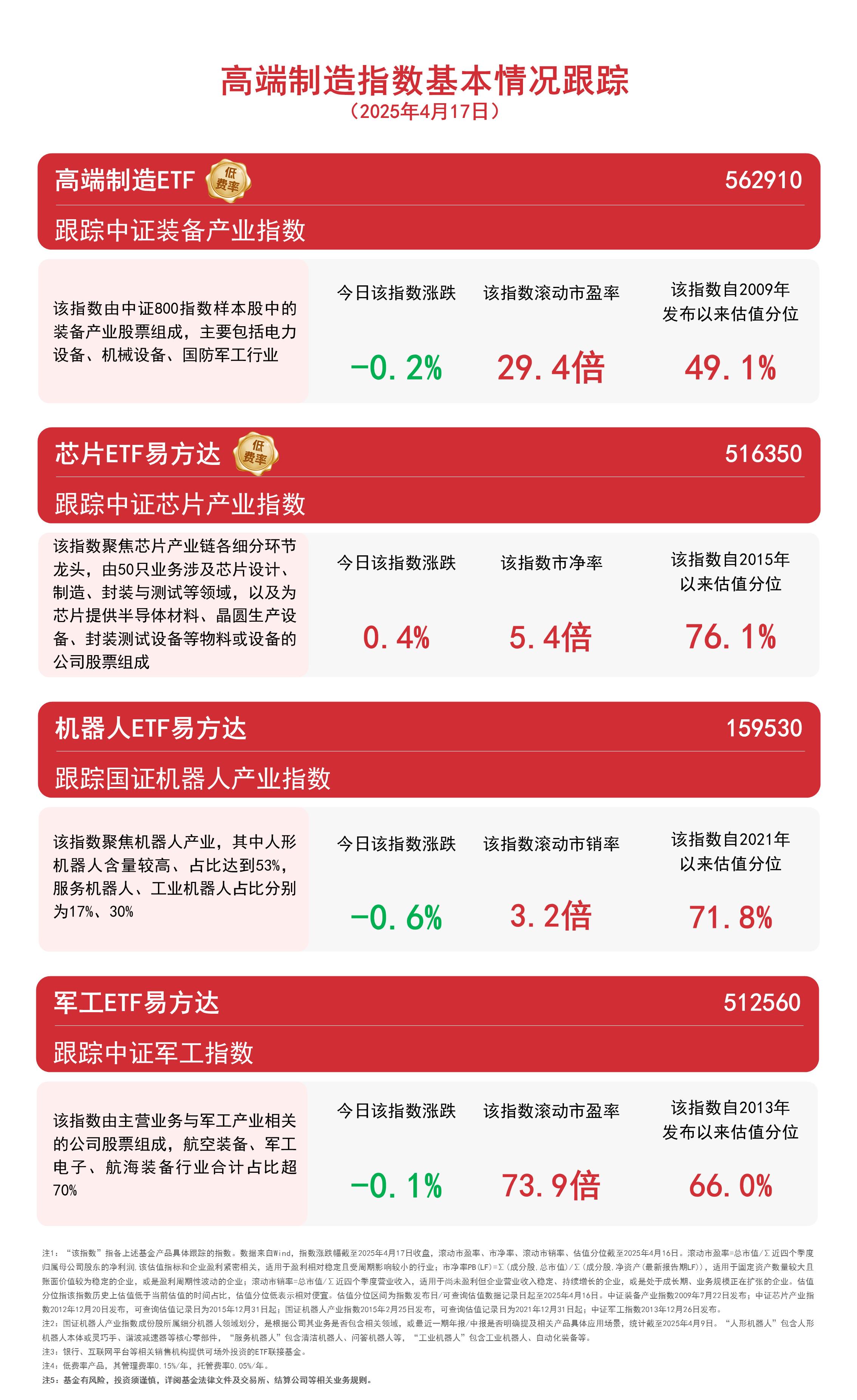 截至收盘,国证机器人产业指数下跌0.6%,中证装备产业指数下跌0.2%,中证军工指数下跌0.1%,中证芯片产业指数上涨0.4%。