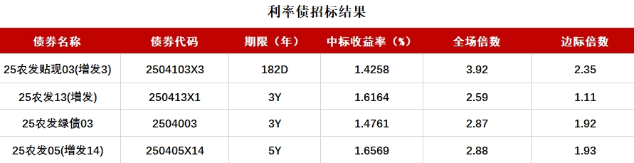 财联社4月21日电,中国农业发展银行四期金融债已结束招标,其中,182天期金融债“25农发贴现03(增3)”中标利率为1.4258%,全场倍数3.92,边际倍数2.35;5年期固息债“25农发05(增14)”中标利率为1.6569%,全场倍数2.88,边际倍数1.93;3年期固息债“25农发13(增发)”中标利率为1.6164%,全场倍数2.59,边际倍数1.11;3年期固息债“25农发绿债03”中标利率为1.4761%,全场倍数2.87,边际倍数1.92。