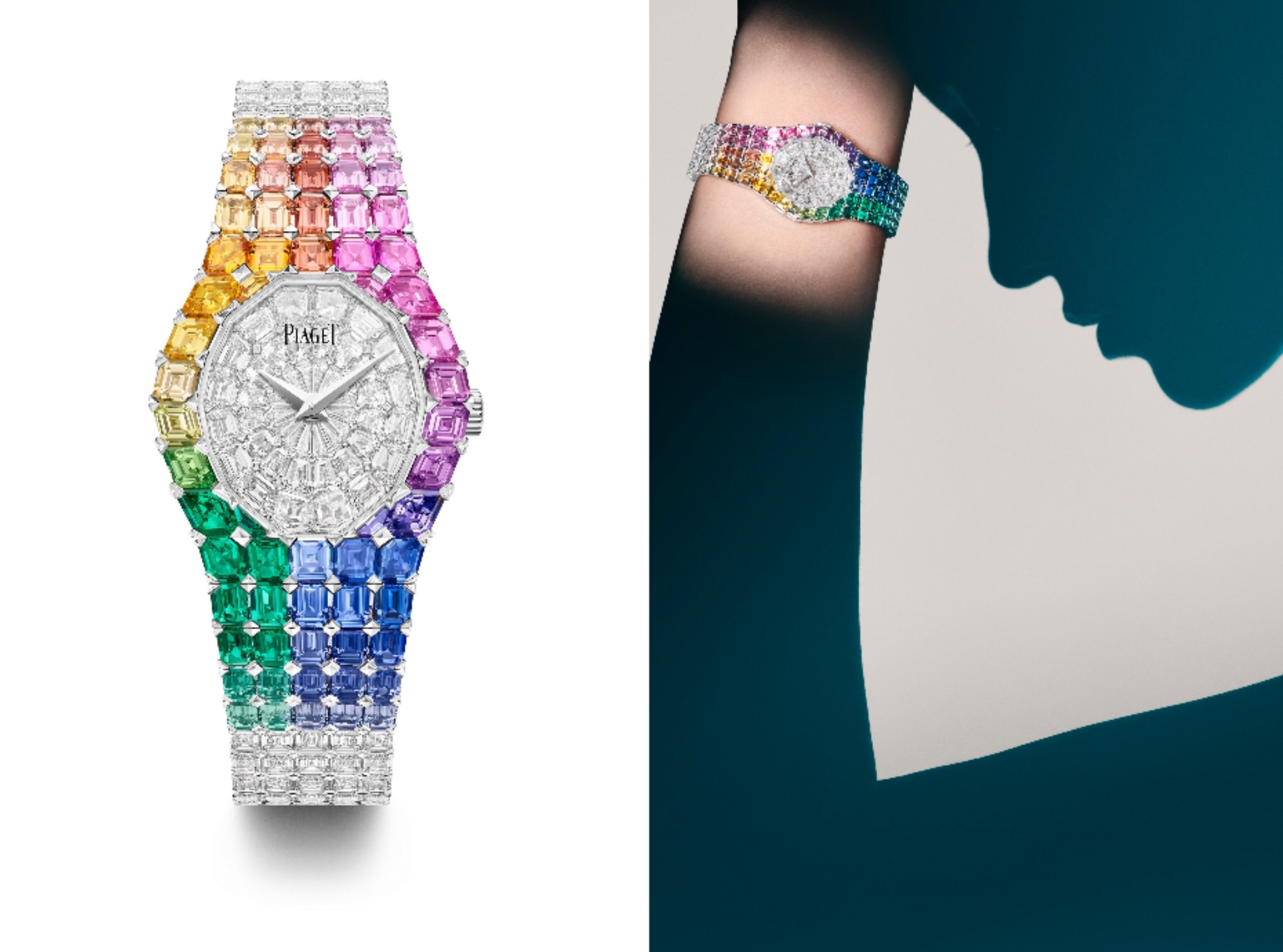 腕表几乎通体铺镶熠熠美钻,每颗钻石皆精心排布,达到几乎隐匿缝隙的视觉效果,同时绽放出一如其名的闪耀光彩,腕表搭载机械机芯。今年伯爵重新诠释经典设计,推出Limelight Aura系列Rainbow高级珠宝腕表,彰显对色彩的娴熟运用。这款非凡杰作选用光谱精确校准的珍稀宝石,每一颗皆经过悉心挑选和巧妙排列,以自然流畅的渐变色调勾勒出彩虹轻架腕间的视觉效果。