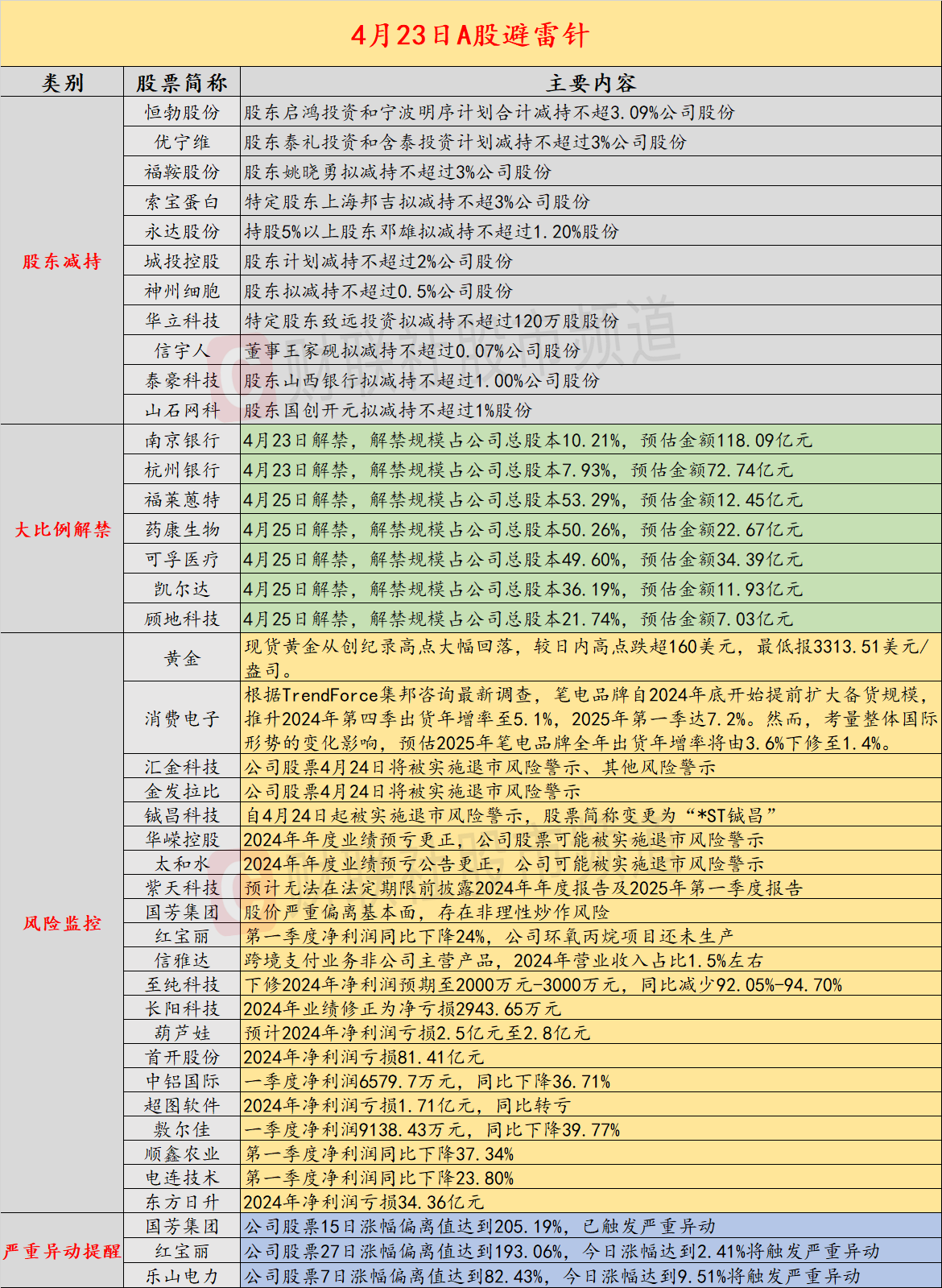 昨日公告的A股拟减持的公司数量较之前有所增多,恒勃股份股东启鸿投资和宁波明序计划合计减持不超3.09%公司股份,优宁维股东泰礼投资和含泰投资计划减持不超过3%公司股份;福莱蒽特、药康生物将迎来超五成以上解禁;上市航空公司3月客座率环比均有所下滑;汇金科技公司股票4月24日将被实施退市风险警示、其他风险警示;深圳水贝金价单克一天涨30元,水贝商家称金价疯涨让金饰卖不动;华嵘控股2024年年度业绩预亏更正,公司股票可能被实施退市风险警示;特斯拉Q1营收不及市场预期,净利润同比下降71%。