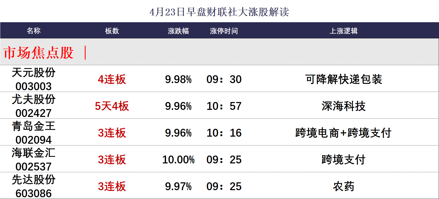财联社4月23日电,今日午盘全市场共55股涨停,连板股总数10只,22股封板未遂,封板率为71%(不含ST股、退市股)。焦点股方面,国芳集团、红宝丽、国光连锁、安记食品等高位人气股跌停,连板高度降至4连板的天元股份。