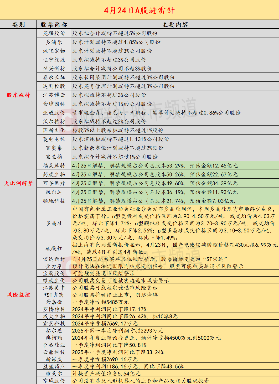 昨日公告的A股拟减持的公司数量较之前有所增多,英联股份股东拟合计减持不超过5%公司股份,多浦乐股东计划减持不超过4.85%公司股份;福莱蒽特、药康生物将迎来超五成以上解禁;硅业分会表示,本周多晶硅成交量维持低位,价格震荡下行;宏达新材自4月25日起被实施其他风险警示,股票简称变更为“ST宏达”;国产电池级碳酸锂价格连跌4日并创逾4年新低;金力泰预计无法在法定期限内披露定期报告,股票可能被实施退市风险警示;COMEX黄金期货跌3.45%报3301.50美元/盎司。