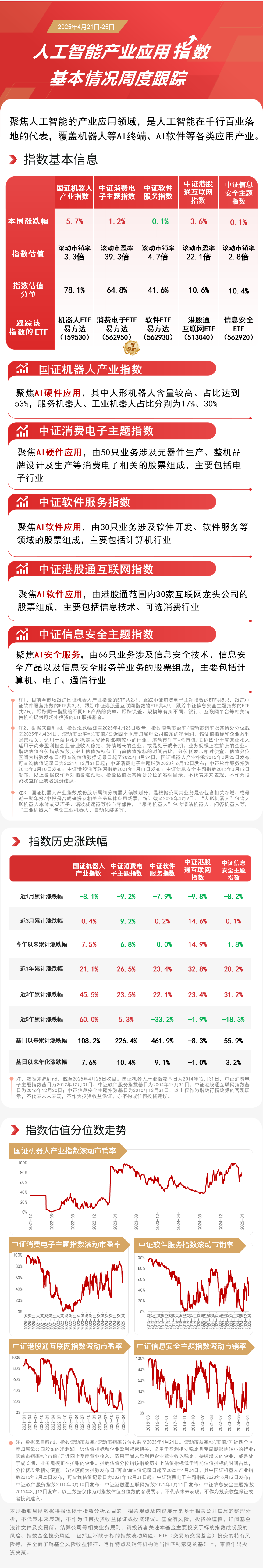 本周国证机器人产业指数上涨5.7%,中证港股通互联网指数上涨3.6%,中证消费电子主题指数上涨1.2%,中证信息安全主题指数上涨0.1%,中证软件服务指数下跌0.1%。Wind数据显示,截至4月24日,机器人ETF易方达(159530)最新规模近10亿元,创下历史新高。