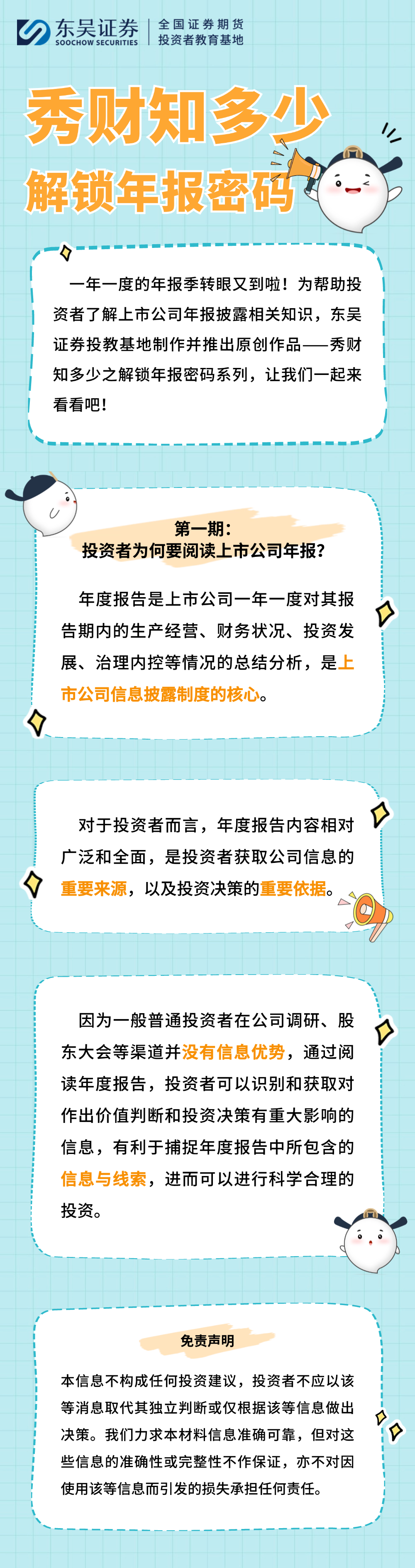又到一年一度的年报季,为帮助投资者了解上市公司年报披露相关知识,东吴证券投教基地制作并推出原创作品——秀财知多少之解锁年报密码系列,让我们一起来看看吧