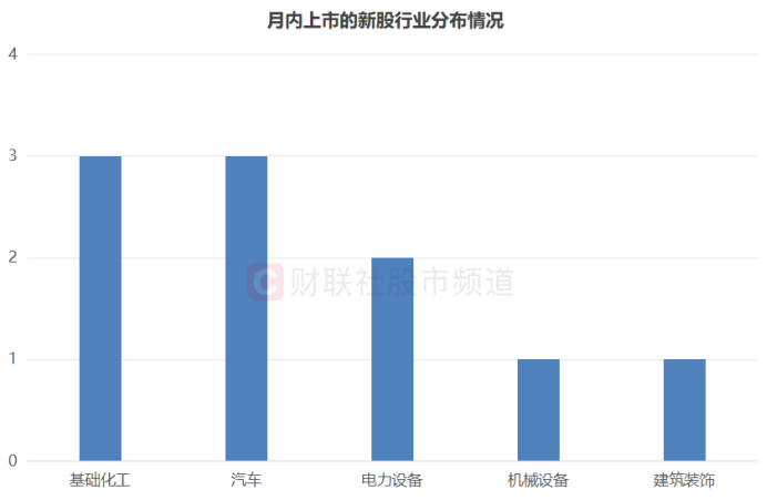 分行业(申万一级)来看,本月目前已上市的10只新股中,基础化工、汽车股数量相对较多,其占比均为30%,同时,还涵盖电力设备、机械设备、建筑装饰板块。若以证券板块统计,月内新股均为沪深个股,其中,沪市主板股、创业板股双双占比近4成,另有20%为深市主板股。