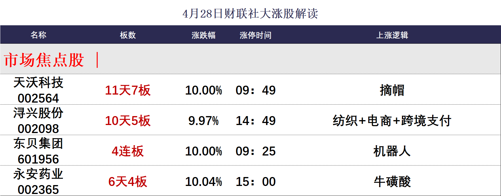 今日共40股涨停,连板股总数13只,19股封板未遂,封板率为68%(不含ST股、退市股)。焦点股方面,摘帽的天沃科技11天7板,机器人概念股东贝集团一字涨停晋级4连板,但其余多数高位股持续退潮,天元股份跌停,步步高跌超8%,新金路、尤夫股份、保税科技、国光连锁等2连跌停。
