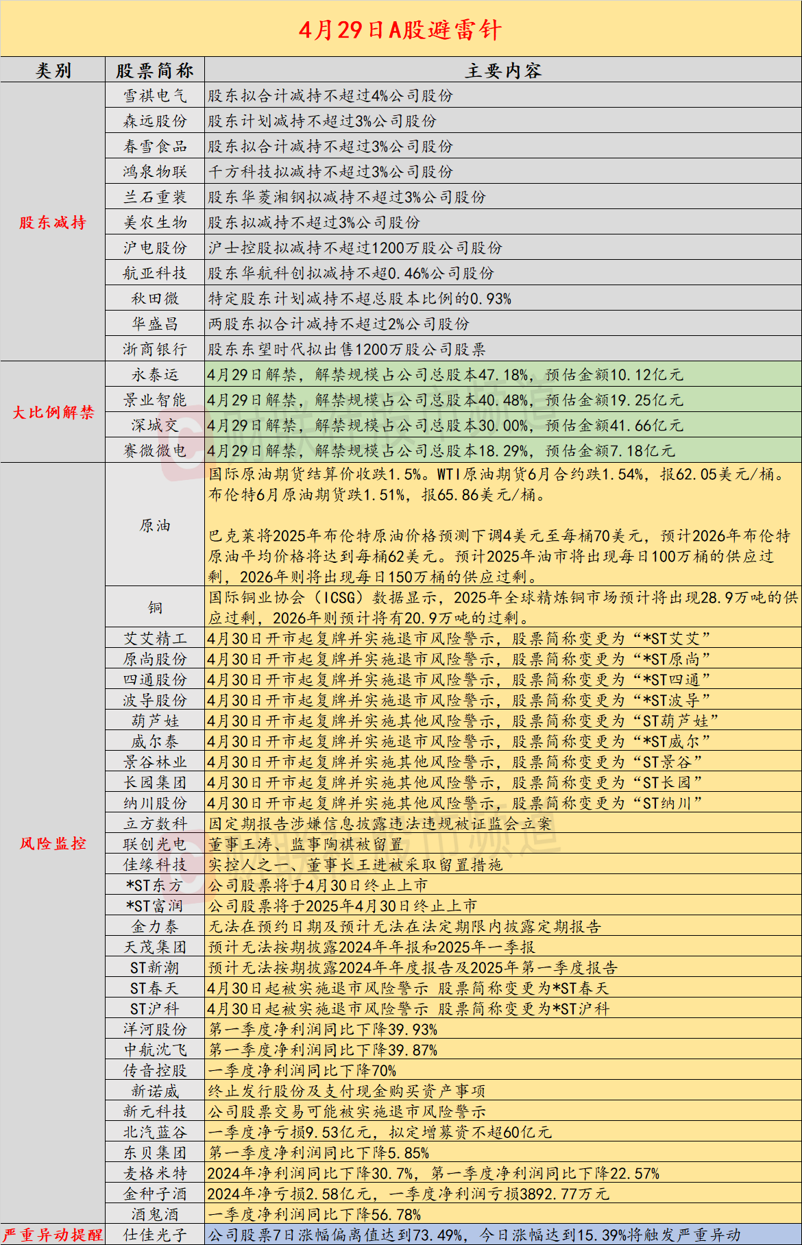 昨日公告的A股拟减持的公司数量较之前有所增减少,雪祺电气股东拟合计减持不超过4%公司股份,森远股份股东计划减持不超过3%公司股份;永泰运、景业智能将迎来超四成以上解禁;国内商品期货夜盘收盘普遍下跌,焦煤跌1.57%;艾艾精工4月30日开市起复牌并实施退市风险警示,股票简称变更为“*ST艾艾”;中国黄金协会数据显示,一季度全国黄金消费量290.492吨,同比下降5.96%;天茂集团预计无法按期披露2024年年报和2025年一季报;美股三大指数收盘涨跌不一,英伟达跌超2%。