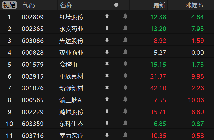 财联社4月30日电,市场焦点股红墙股份(9天6板)低开4.84%,化工股永安药业(7天5板)低开7.95%、先达股份(7天5板)高开1.59%,大消费板块茂业商业(4板)平开、会稽山(3天2板)低开1.75%,PEEK概念股中欣氟材(6天4板)竞价涨停、新瀚新材(4天2板)高开2.26%,业绩超预期的渝三峡A(3板)竞价涨停、鸿博股份(3板)高开8.80%,AI概念股东珠生态(5天3板)低开0.87%、塞力医疗(3天2板)高开0.58%。