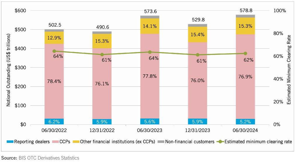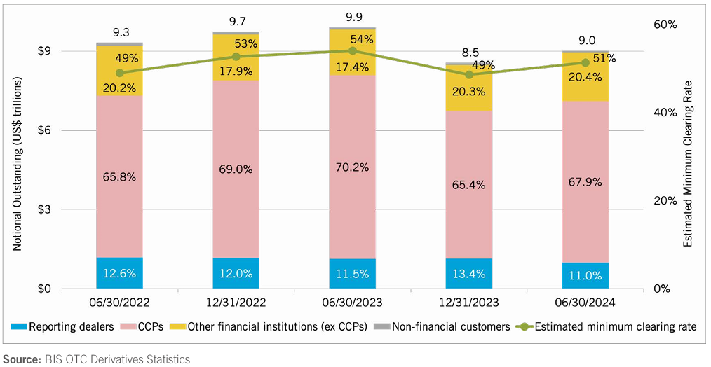 2024年上半年,由中央对手方(CCPs)清算的利率衍生品(IRD)名义本金占比为76.9%,总额达到445.0万亿美元。根据估算,IRD的最低集中清算率为62.5%,低于1年前的63.6%[6](见图11)。