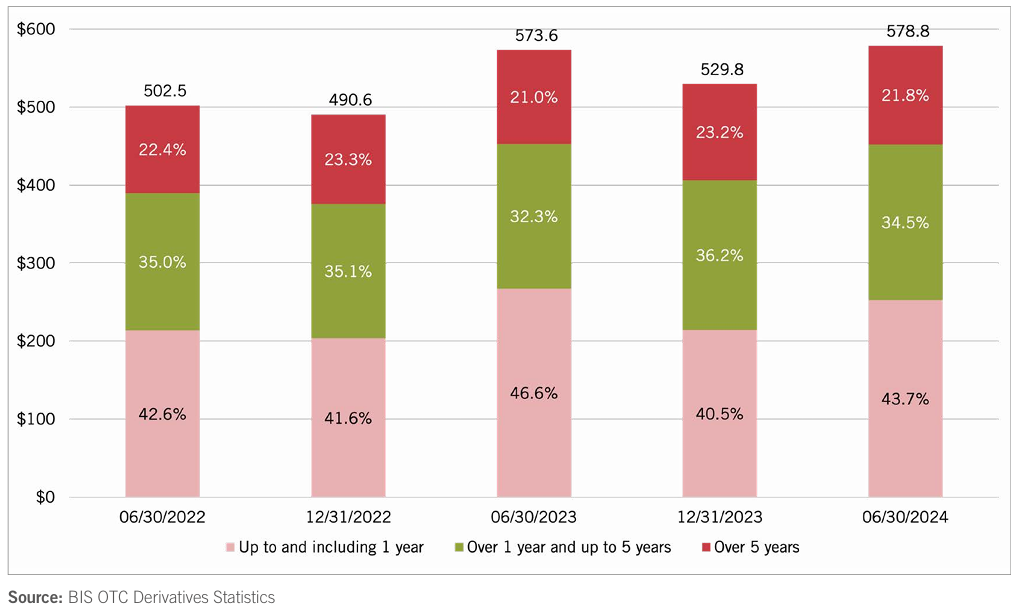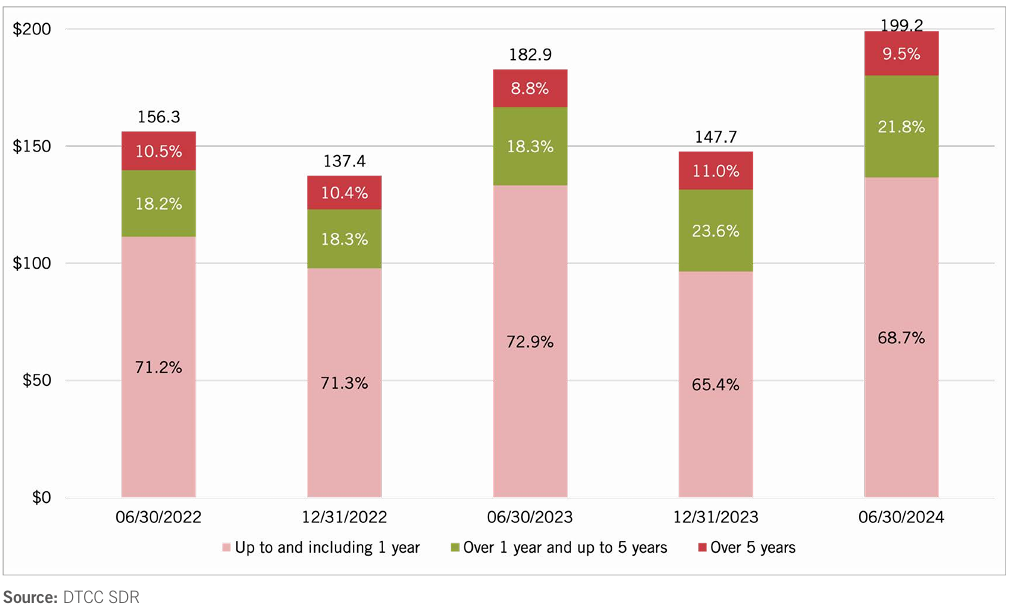 截至2024年6月底,离协议到期剩余时间不超过一年(含一年)的利率衍生品(IRD)名义本金为252.7万亿美元,占全部IRD名义本金总额的43.7%。离协议到期剩余时间超过一年且不超过五年的IRD名义本金为199.7万亿美元(占全部IRD名义本金总额的34.5%),离协议到期剩余时间超过五年的名义本金为126.2万亿美元(占全部IRD名义本金总额的21.8%)(见图10)。