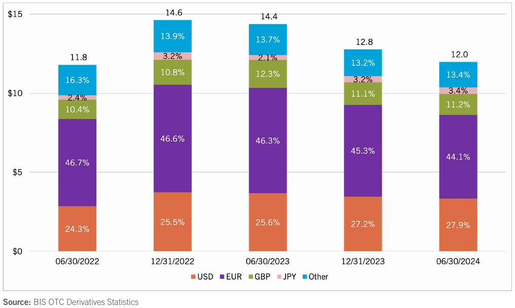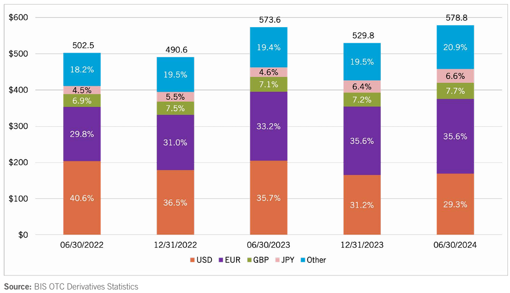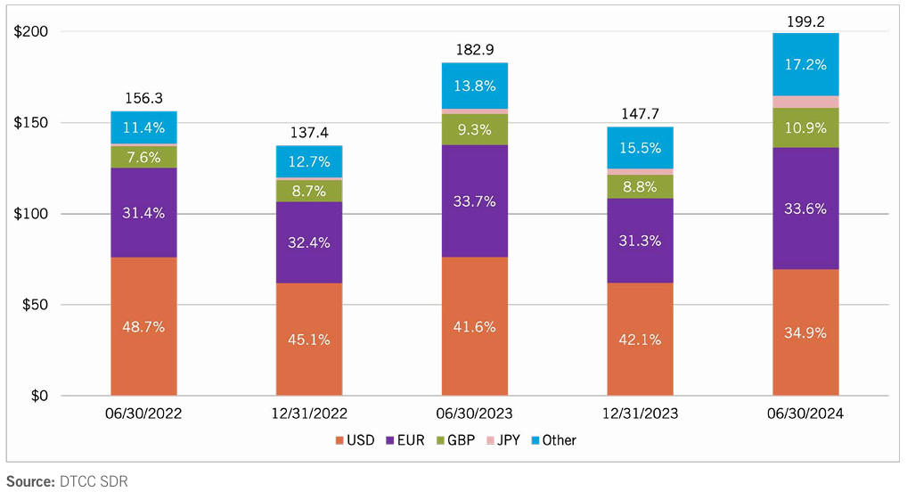 以欧元计价的利率衍生品(IRD)名义本金增加8.2%,达到206.1万亿美元,占2024年6月底全球IRD名义本金总额的35.6%(1年前这一比例为33.2%)。