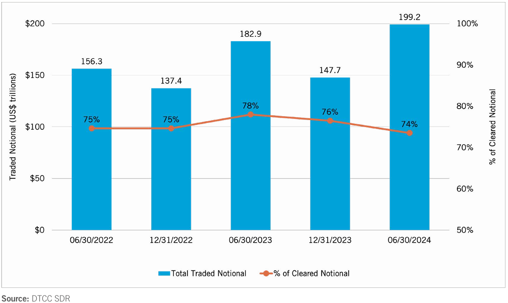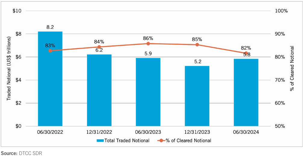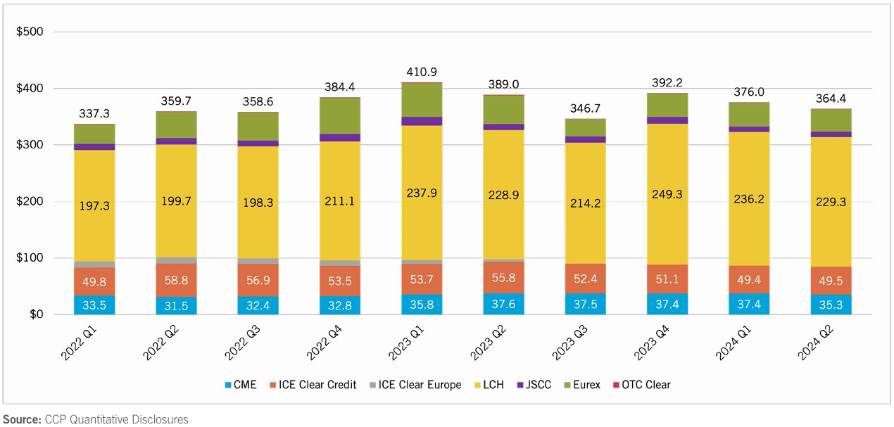 截至2024年年中,市场参与者在所有主要中央对手方(CCP)中集中清算的利率类衍生品和CDS交易,所提交的初始保证金(IM)为3644亿美元,而2023年年中该数额为3890亿美元。