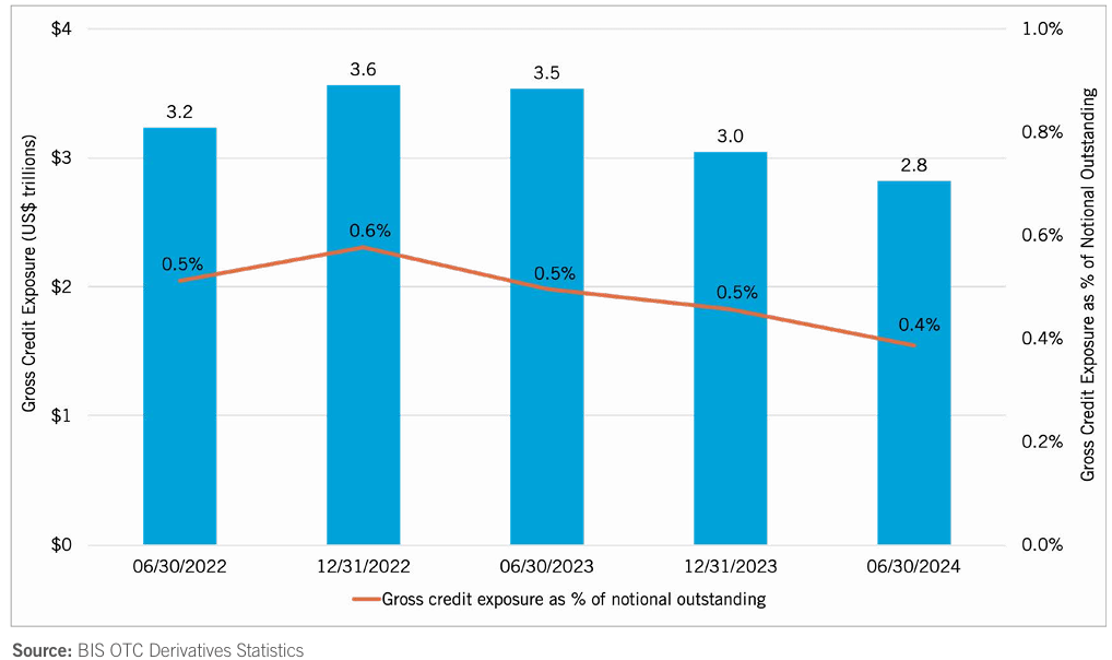 场外衍生品的总信用风险敞口[3](一个更准确衡量对手方信用风险的指标)下降了20.2%,总计达到2.8万亿美元,占名义本金的0.4%(见图3)。