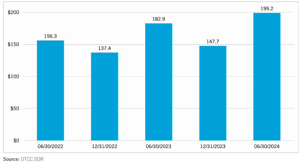 根据ISDA SwapsInfo数据,2024年上半年在美国申报的利率衍生品(IRD)交易量增加8.9%,达到199.2万亿美元(2023年同期为182.9万亿美元)[7](见图12)。