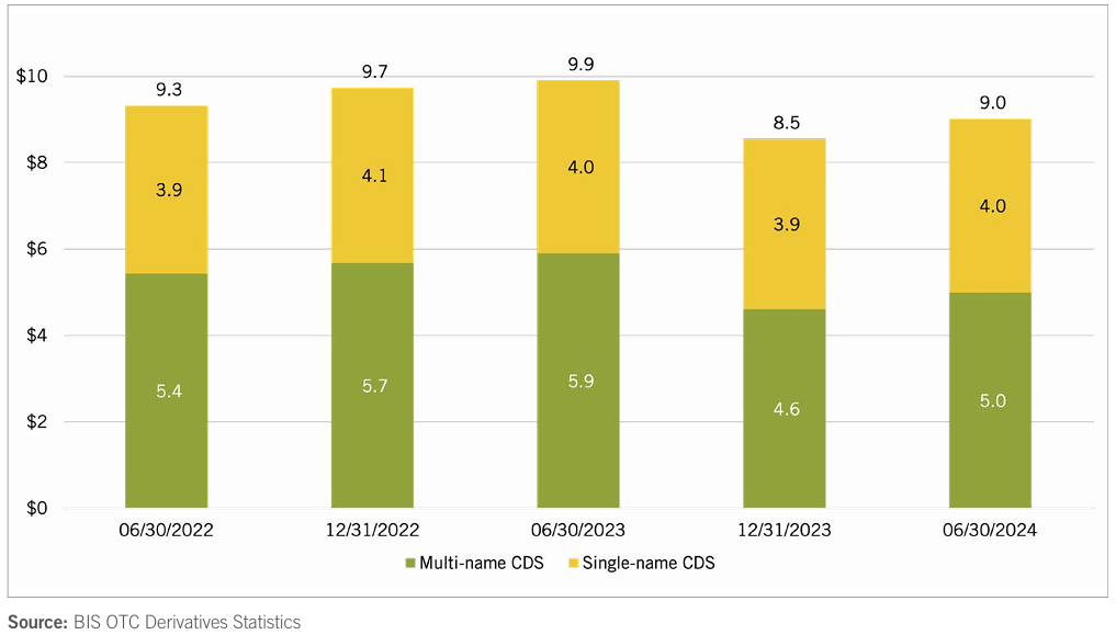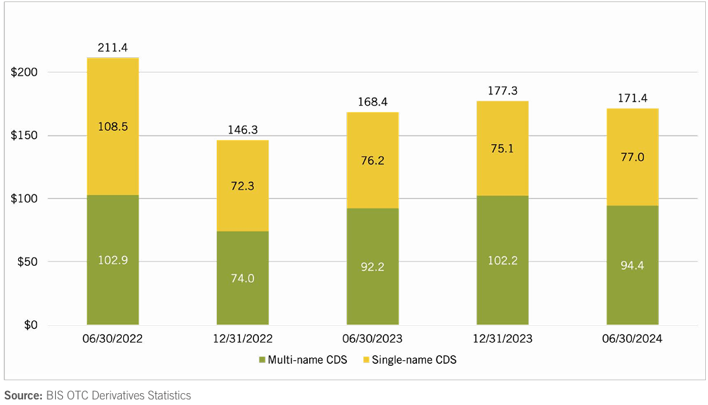 根据国际清算银行(BIS)的数据,2024年年中的信用违约互换(CDS)名义本金(含单名和多名CDS)为9.0万亿美元,较2023年年中下降了9.0%,较2023年年底上升5.4%。单名CDS名义本金增加了0.4%,至4.0万亿美元,多名CDS名义本金下降15.3%,至5.0万亿美元(见图17)。