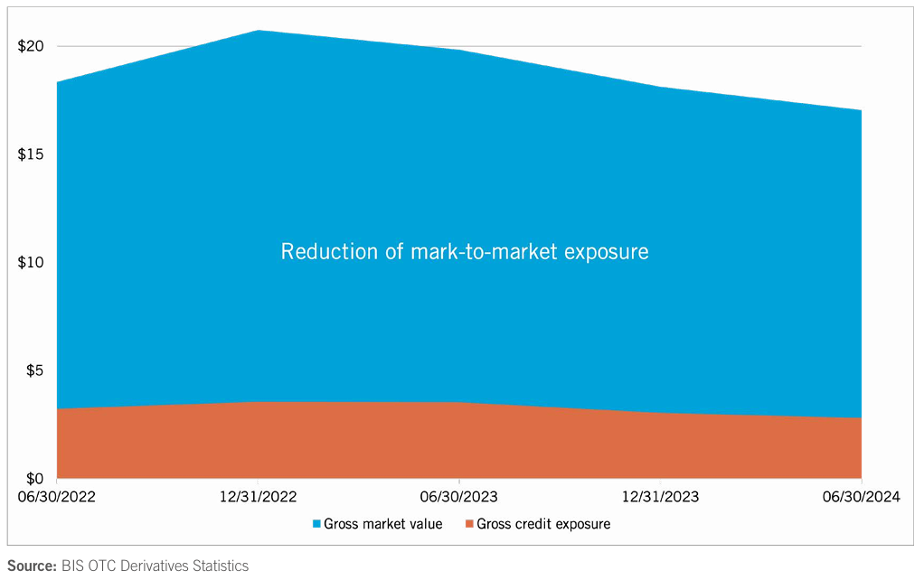 截至2024年年中,市场参与者通过终止净额结算将盯市风险敞口减少了83.5%(见图4)。同时因为集中清算和非集中清算的衍生品交易提交了抵押品,信用风险进一步降低。