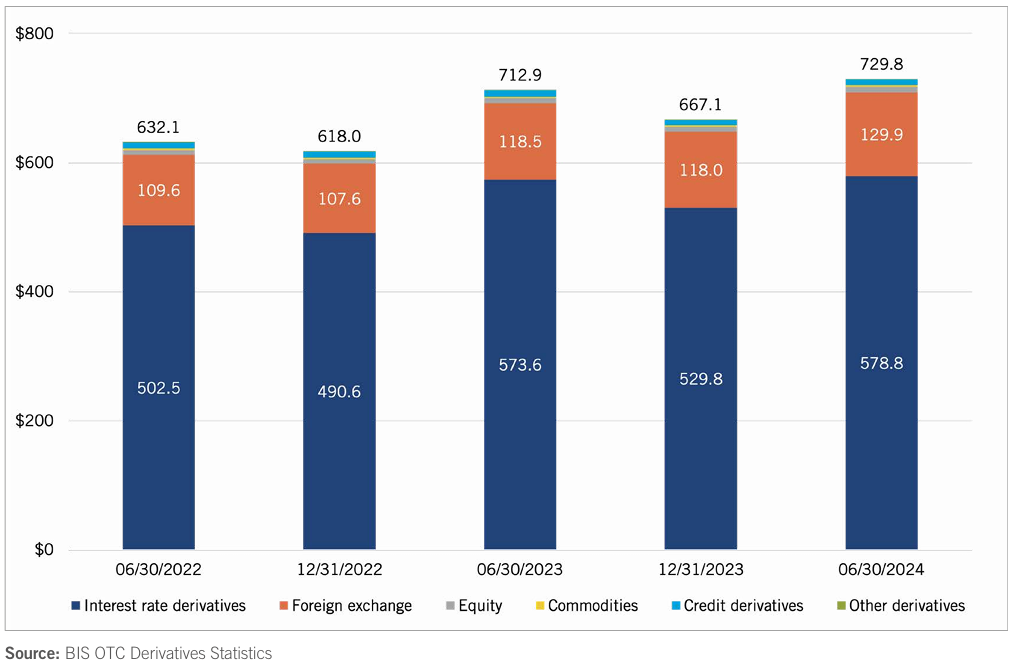 截至2024年6月底,全球场外衍生品名义本金总额升至729.8万亿美元,比2023年年中增长了2.4%,比2023年年底增长了9.4%[1]。这种增长情况是季节性模式的一种反映,即名义本金通常在上半年上升,下半年下降。
