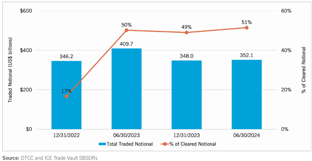 2024年上半年,在美国申报的、挂钩特定证券或证券组合信用风险的金融衍生工具的名义本金从2023年同期的4097亿美元下降至3521亿美元[10]。通过中央对手方集中清算的证券类信用衍生品名义本金占全部信用衍生品名义本金的51.5%[11](见图21)。