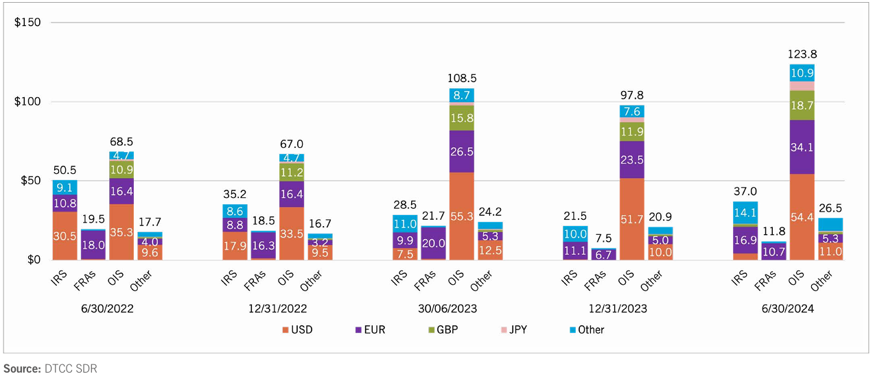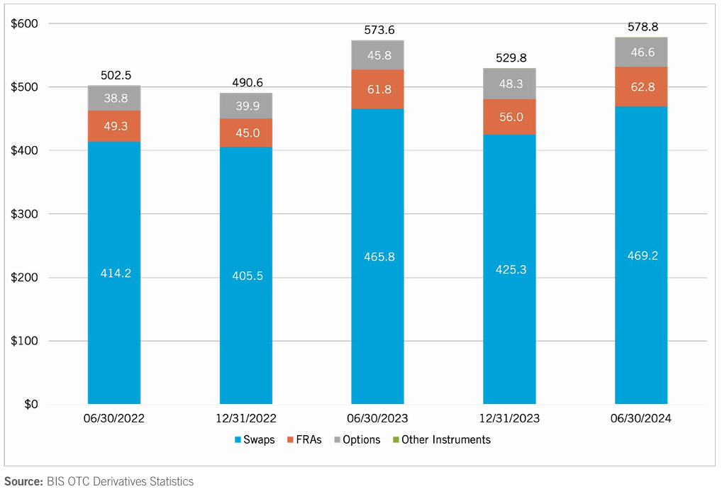 利率互换(IRS)的名义本金上升了0.7%,达到469.2万亿美元,占2024年年中IRD名义本金总额的81.1%,而利率远期(FRA)的名义本金增长了1.7%。FRA和期权的名义本金分别为62.8万亿美元和46.6万亿美元(见图6)。