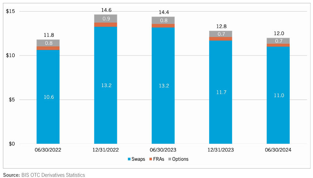 截至2024年6月底,全球利率衍生品(IRD)的总市值较去年同期下降16.7%,从14.4万亿美元降至12.0万亿美元,其中利率互换(IRS)的总市值下降16.5%(从1.32万亿美元降至1.1万亿美元),利率远期(FRA)的总市值下降18.8%,期权的总市场价值下降了19.5%(见图8)。