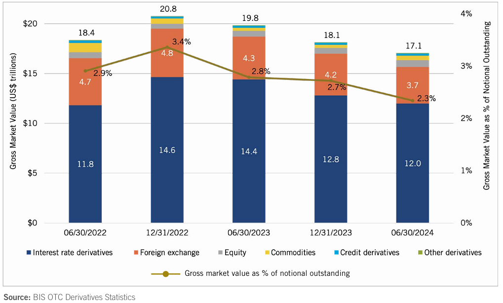 到2024年6月底,场外衍生品的总市值较2023年年中(同比)下降了14.0%,降至17.1万亿美元,主要由美国利率政策的调整所驱动。总市值是名义本金总额的2.3%,而一年前为2.8%(见图2)。