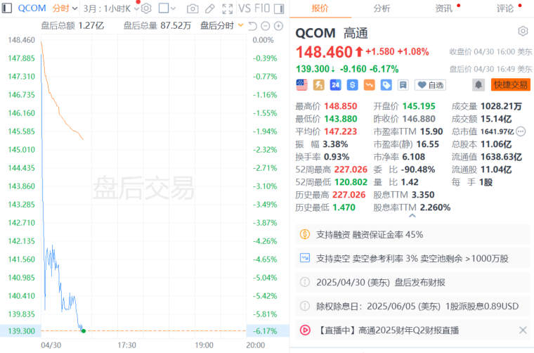 财联社5月1日电,高通美股盘后跌超6%。公司预计第三季度营收99亿美元至107亿美元,市场预估103.3亿美元。